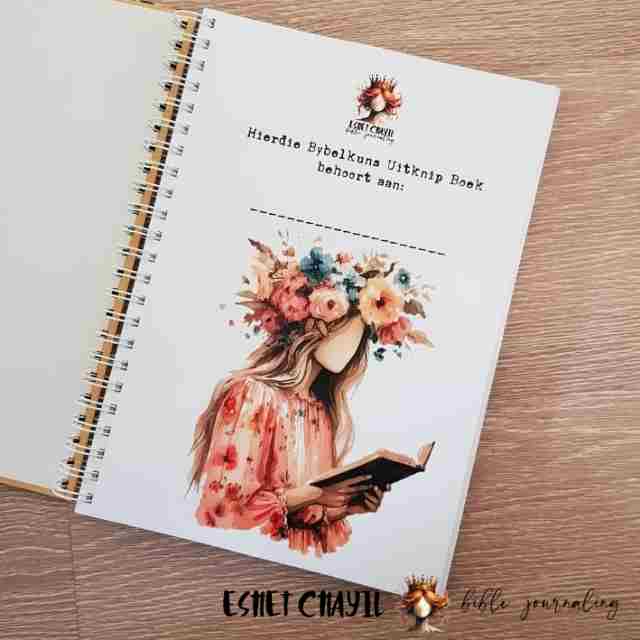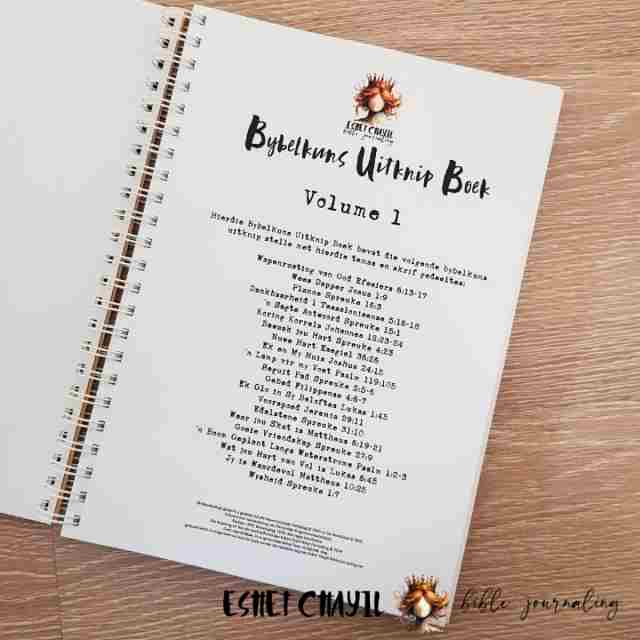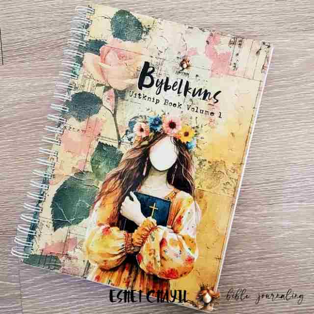 This Bible Art Cutout Book in Afrikaans - consists a glossy hard cover , spiral bound with white wire binding, with 84, 160gsm pages printed in full colour. Perfect for bible journaling or faith journaling with my Bible Art Journals