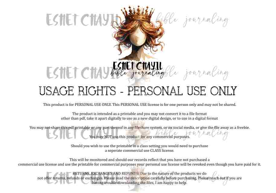 This bible journaling printable consists of a 2 page pdf and can be printed up to A4 sized at 300dpi. Perfect for bible journaling in a journaling bible or my lent journal: https://eshetchayil.myshopify.com/products/bible-art-journal-journal-english