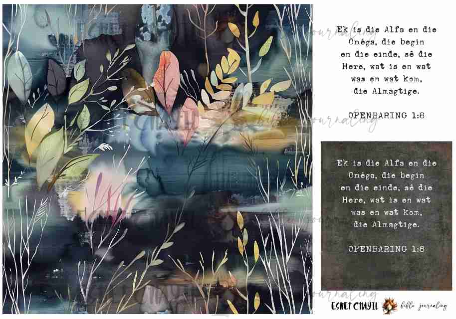 This bible journaling printable consists of a 2 page pdf and can be printed up to A4 sized at 300dpi. Perfect for bible journaling in a journaling bible or my Lent journal: https://eshetchayil.myshopify.com/products/bible-art-journal-lent-afrikaans